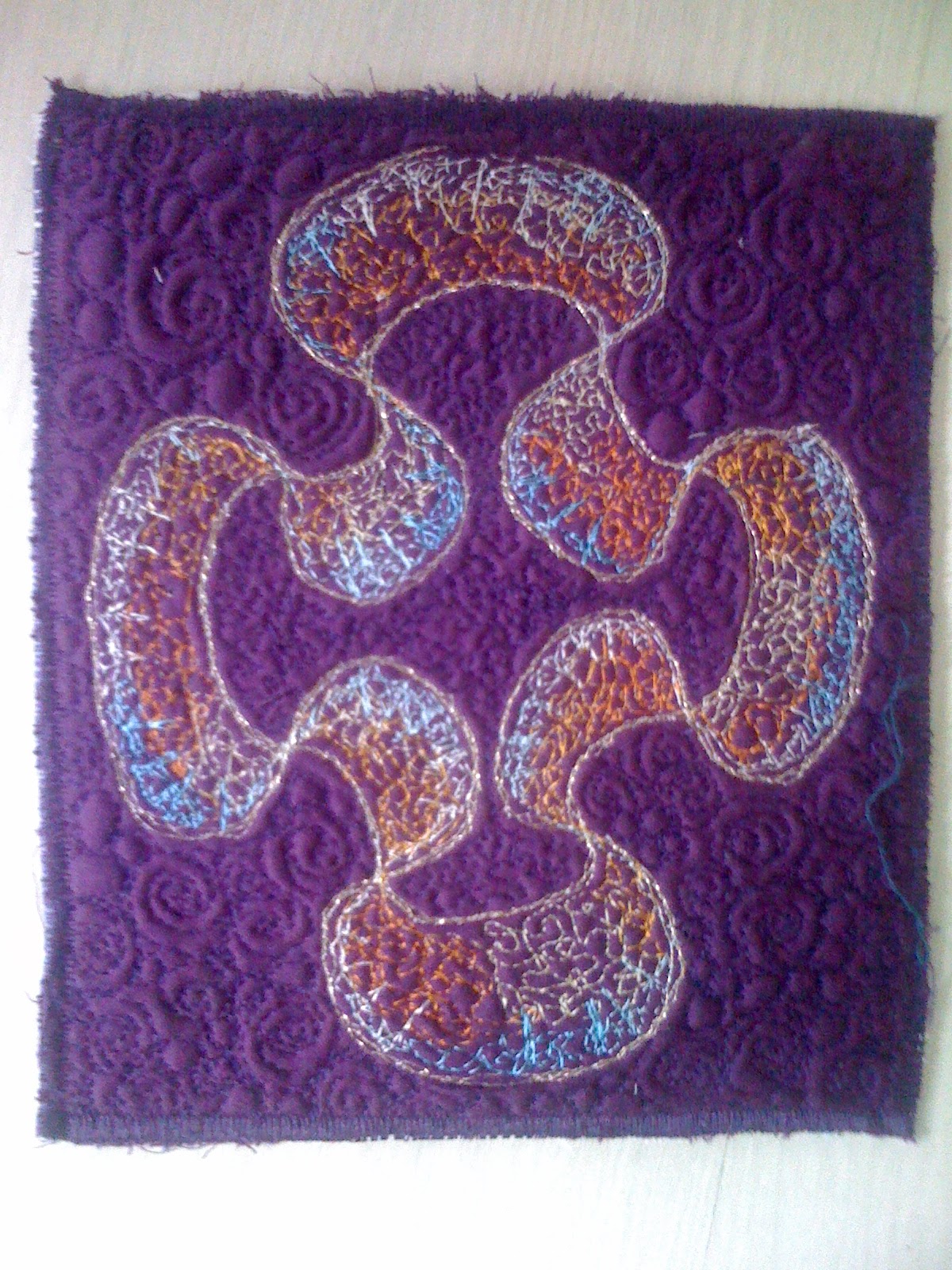 1. I still have those big pieces of purple Egyptian cotton. Two 100 inch square and two 35 inch square. I started to quilt a whole cloth of the smaller pieces. Almost 30% of the quilting is finished. Quilting, micro quilting and hyper quilting with different colours of thread and metal thread. I will finish it this weekend. Fun! It will be the first quilt wall hanging in my house.